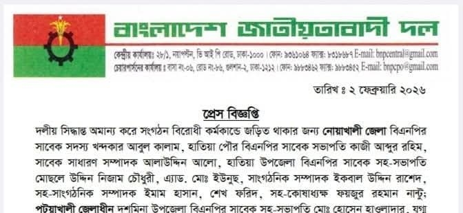 দলীয় সিদ্ধান্ত অমান্য করে সংগঠনবিরোধী কর্মকাণ্ডে জড়িত থাকার অভিযোগে নোয়াখালীর হাতিয়ায় বিএনপির ৯ নেতাকে দল থেকে বহিষ্কার করা হয়েছে। সোমবার